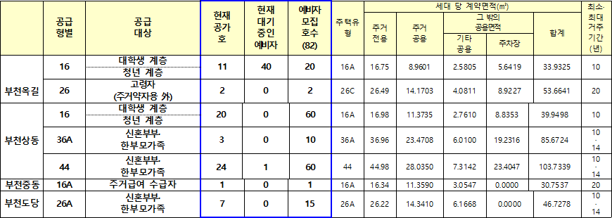 LH 부천시 행복주택, 부천옥길LH8단지, 부천상동, 부천중동, 부천도당행복주택아파트 공고입니다. 금회 모집 예비입주자는 현재 공가 및 향후 해약세대가 발생할 경우를 대비하여 모집하는 것으로, 예비입주자로 선정되었다 하더라도 예비순번에 따라 실제 입주 시까지는 상당기간 소요될 수 있습니다.