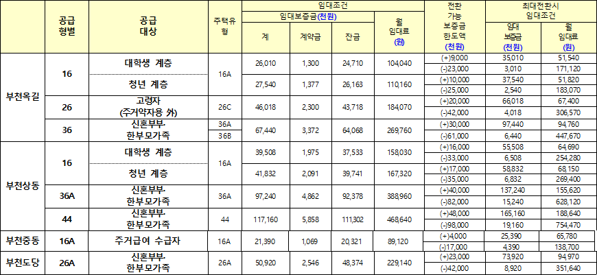 ① 소득이 없는 “청년 계층” 신청자는 동일 면적의 “대학생 계층” 임대조건이 적용됩니다. 해당 임대조건은 갱신계약 전까지 유지되며 갱신계약 시 소득 유무에 따라 변경된 임대조건을 적용합니다.