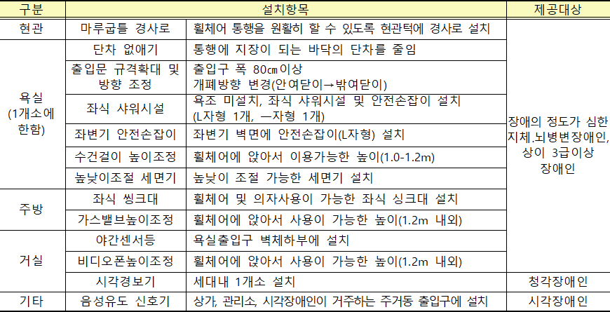 장애인의 편의증진을 위해 최초 입주자 본인 또는 세대원이 아래의 제공대상에 해당하는 경우 신청자에 한하여 제공대상별 편의시설을 무료로 설치하여 드립니다.
