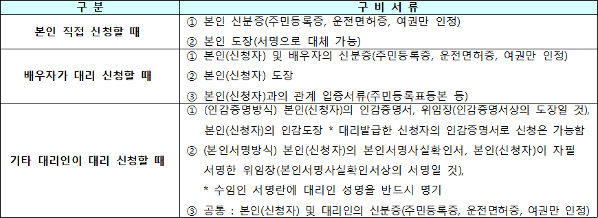 | • 신청자의 직계존속, 직계비속 • 신청자의 배우자의 직계존속 • 신청자의 직계비속의 배우자 | ① 신청자와 세대별 주민등록표등본상에 함께 등재되어 있는 사람 및 ② 신청자의 분리배우자와 세대별 주민등록표등본상에 함께 등재되어 있는 사람 |