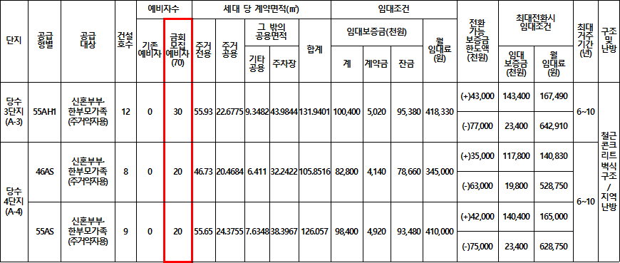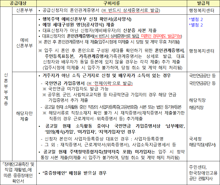 | 입주자격 | 신혼부부·한부모가족 계층이면서 주거약자 (세대원수별 면적기준, 기간요건 완화) |