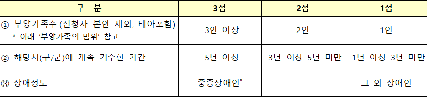| 3순위 | 전년도 도시근로자 가구원수별 월평균소득의 150% 이하 및 완화된 기간요건을 충족하는 자 |